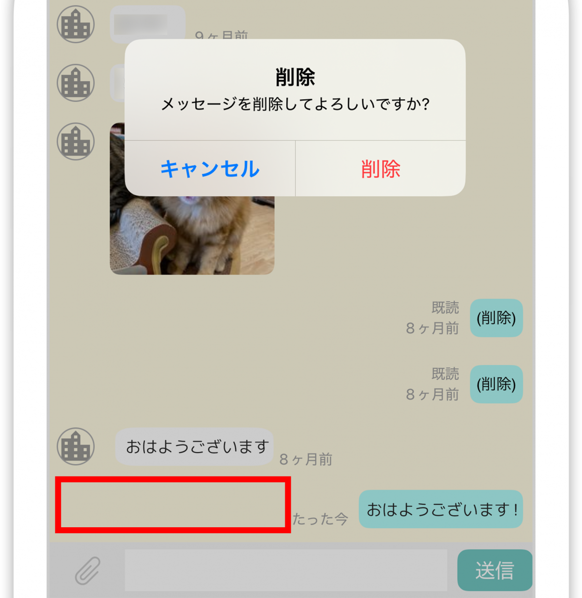 削除したいメッセージの横の空白部分を長押しすると削除できます。