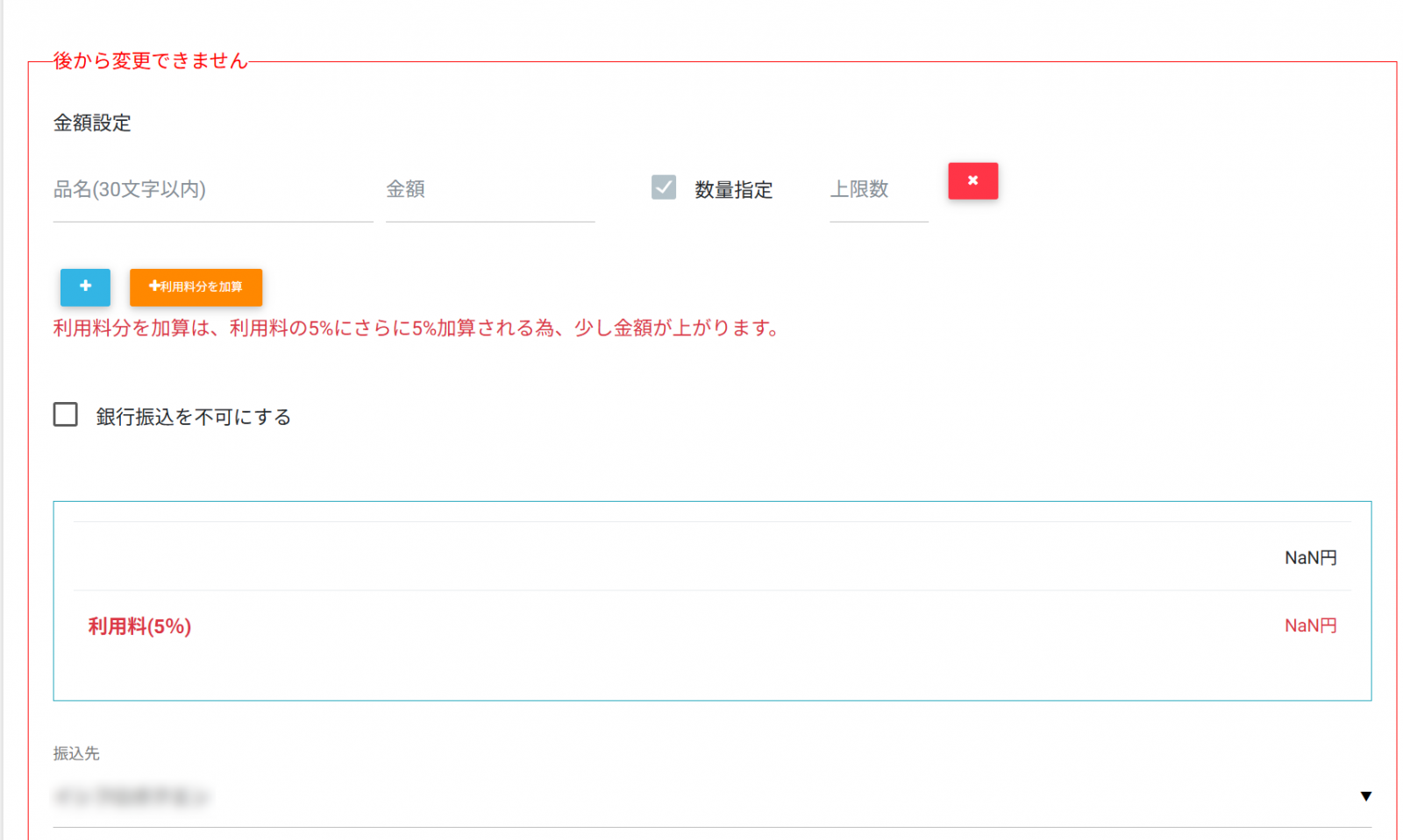 振込先に入金される際には利用料が引かれますのでご注意下さい。 金額・振込先の設定は新規作成後、編集できませんので変更がある場合は新しく集金設定を作成して下さい。