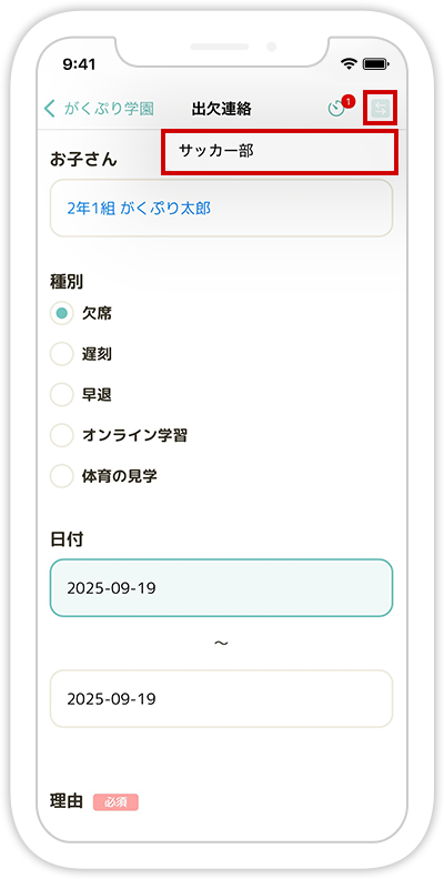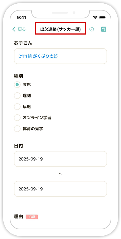 該当のお子さんを選択し、出欠連絡の種別(欠席、遅刻、早退など)を選択し送信します。