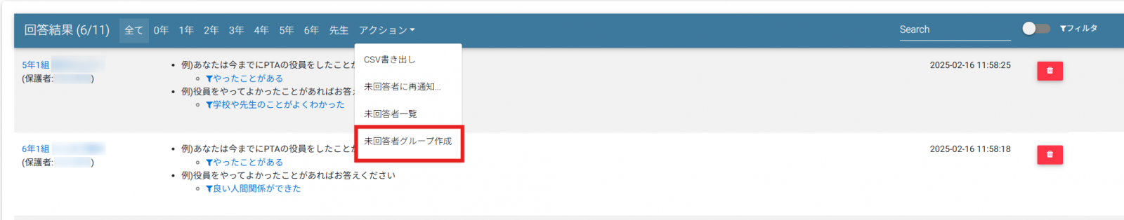 回答結果から未回答者一覧、既読情報から未読者一覧が見れます。